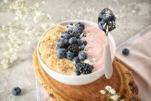 • Joghurt mit Brombeeren, Blaubeeren, Banane und Kokosflocken