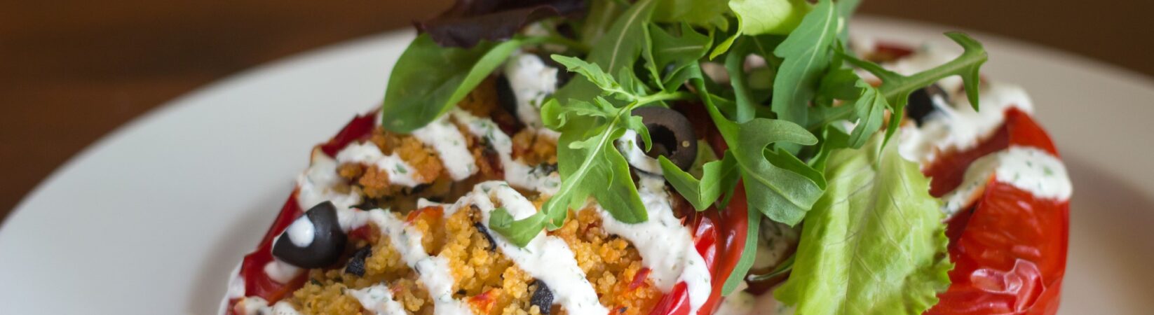Gefüllte Paprika mit Oliven-Couscous und Joghurtsauce