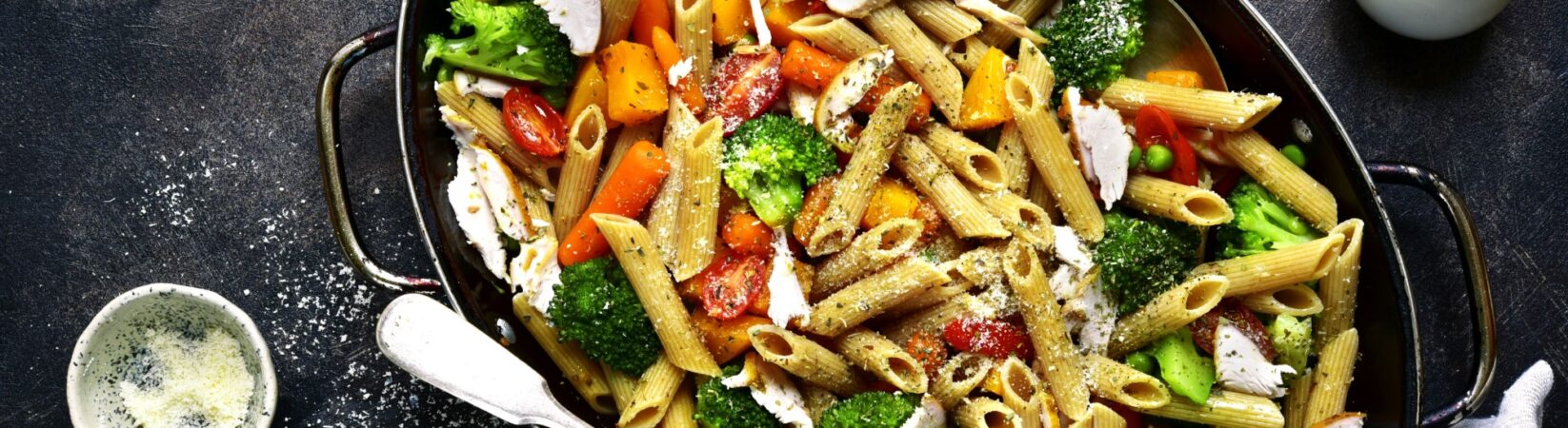Kichererbsen Nudeln mit Hähnchen, Brokkoli, Möhre und Tomaten