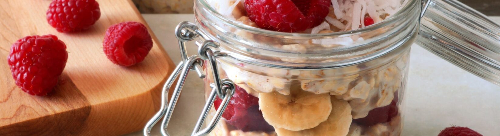 Overnight Flakes mit Banane, Himbeeren und Kokosraspel