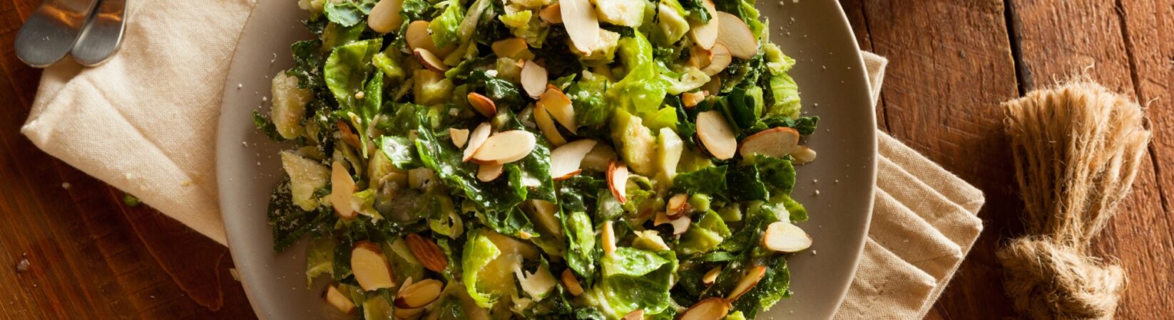 Rosenkohlblättchensalat mit Mandeln und veganem Parmesan