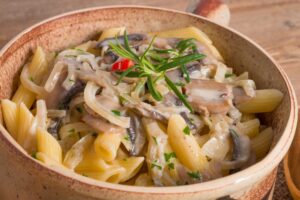 Zoodles mit Feta, Pinienkernen und Erbsen
