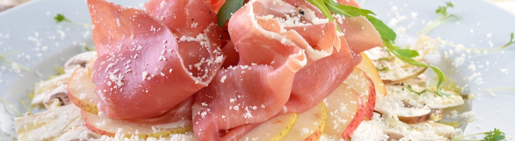 Schinkencarpaccio mit Champignons und Knoblauchquarkbrot