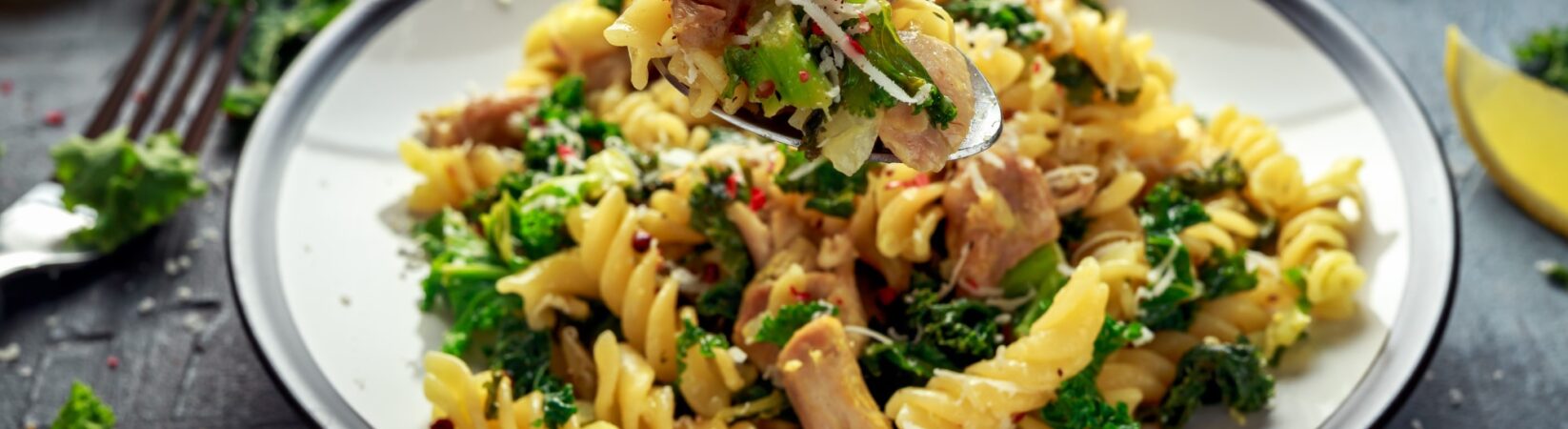 Schweinegeschnetzeltes mit Grünkohl, Nudeln und Parmesan