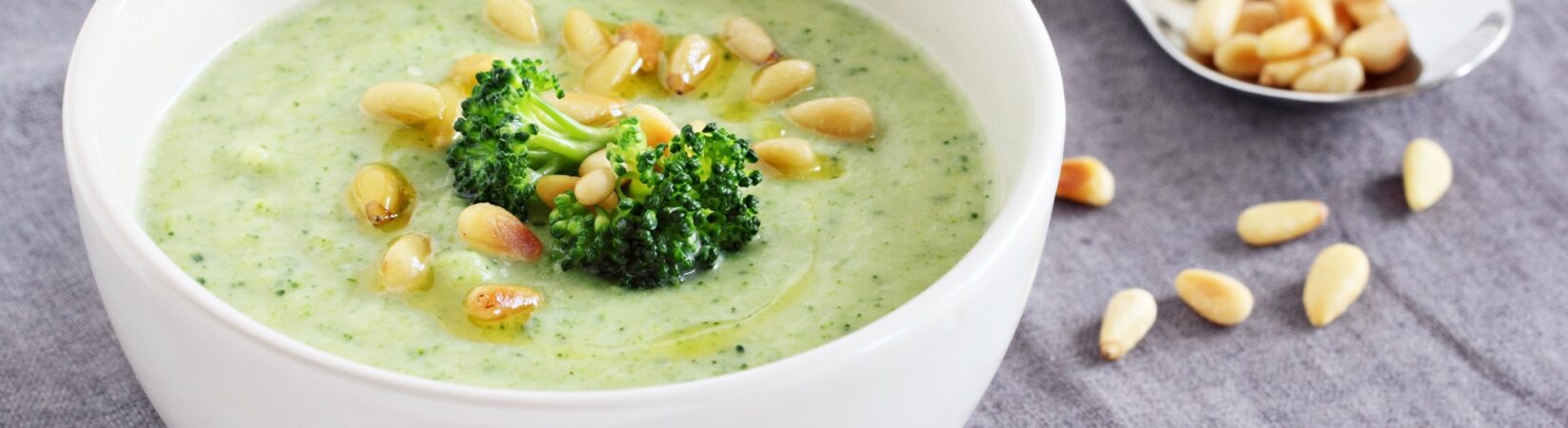Suppe mit Soja-Hackfleisch, Kartoffeln, Brokkoli und Pinienkernen