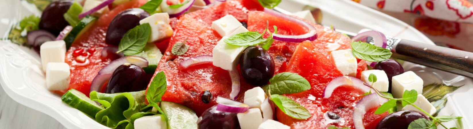 Wassermelonensalat mit Trauben, Gurke und veganem Feta